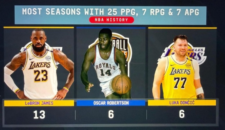 Averaged 25+7+7 games per game in a single season: James 13 times, the most in history, Doncic second in Big O history
