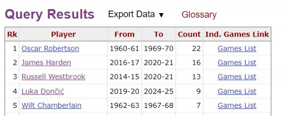 This is Harden's 17th 40+ triple-double in his career. He currently ranks second on the NBA's historical 40+ triple-double list, 5 times behind the Big O.