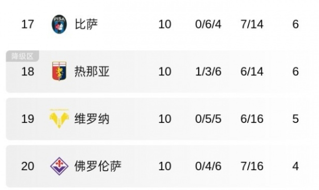Fiorentina is at the bottom of the standings with 4 draws and 6 losses since the start of this season's Serie A. It is one of the three teams without a win. The team lost 0-1 at home to Lecce this round and suffered two consecutive defeats.