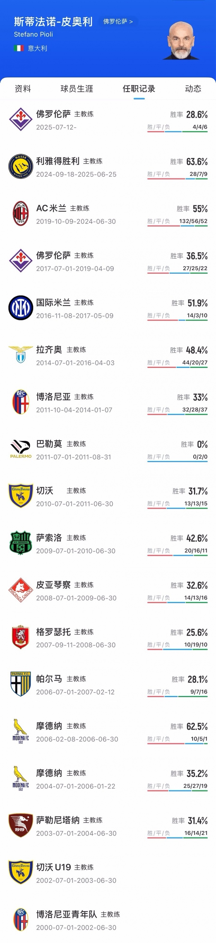 Pioli only entered the palace for the second time in July this year and became the Viola coach again. So far, he has only led the team to play 14 games, with a record of 4 wins, 4 draws and 6 losses. All 4 wins were achieved in the UEFA Europa League.