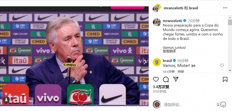 Ancelotti posted his photos at the press conference and wrote: "Our World Cup preparations are now beginning. We hope to go to the World Cup with strong strength, unity and shoulder the dream of the entire Brazil. Let's cheer together!"