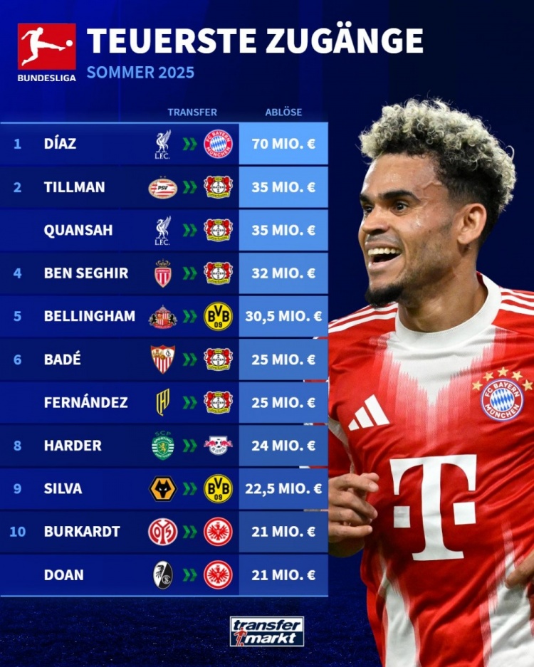 The Bundesliga summer window has ended, and "Transfer Market" also counts the most expensive signing list of the Bundesliga this summer, with Louis Dias leading the way.