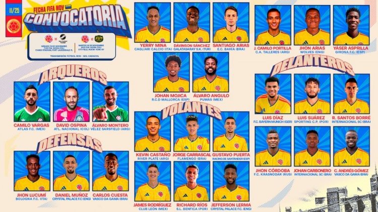 Defenders: Lucumi (Bologna), Munoz (Crystal Palace) ), Carlos Cuesta (Vasco da Gama), Mina (Cagliari), Davinson Sanchez (Galatasaray), Santiago Arias (Bahia), Mojica (Mallorca), Angulo (Mexican Pumas)
