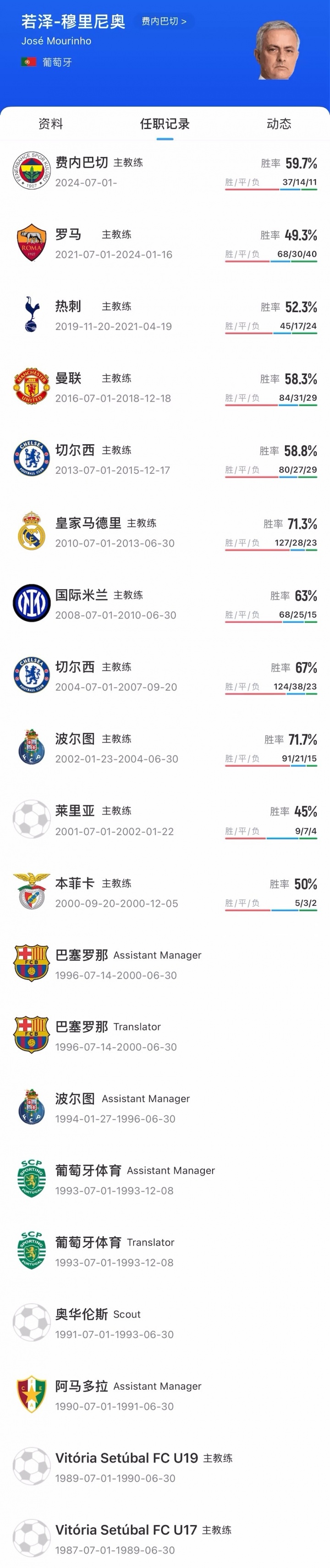 This is the 11th time in Mourinho's career he has stepped down from the position of club head coach. It is worth mentioning that Mourinho coached Fenerbahce for only one year, far lower than the previous coaching time.