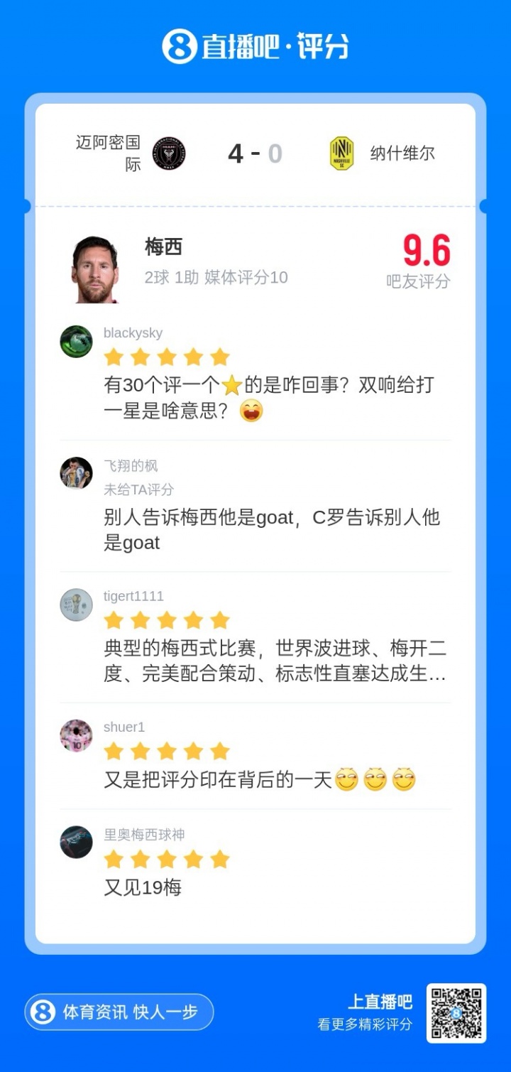 More than 3,600 netizens have rated Messi. The current rating is 9.6, with 94.5% five stars and 4.9% one star.