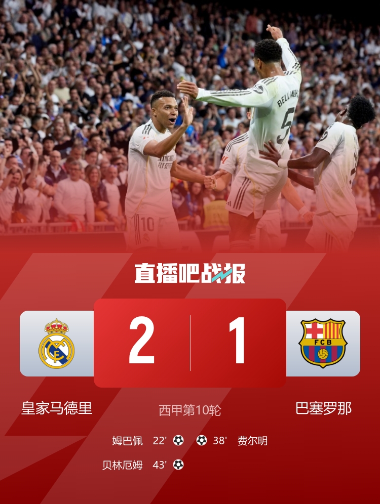 In the 10th round of La Liga, Real Madrid defeated Barcelona 2-1. La Liga started with 9 wins, 1 loss and 5 points, and Barcelona ranked second.