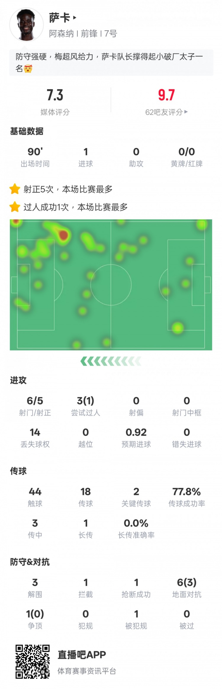 Saka s statistics for this game: 1 goal, 2 key passes, 1 dribble success, rating 7.3