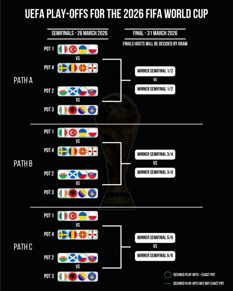The media predicts the World Cup qualifying play-off brackets: Ukraine and Poland are in the first pot, and Slovakia is in the second pot.