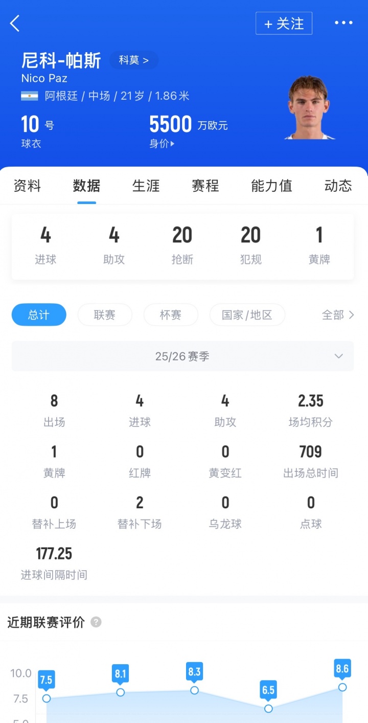 Romano said in the podcast: "Paz's talent is amazing and has attracted the attention of all Europe. Tottenham had tried to sign him before, with a total offer of up to 70 million euros. However, both Como and Real Madrid rejected the offer. You know, although Paz nominally belongs to Como, Real Madrid has 50% of his transfer share and a buy-back clause of 10 million euros.